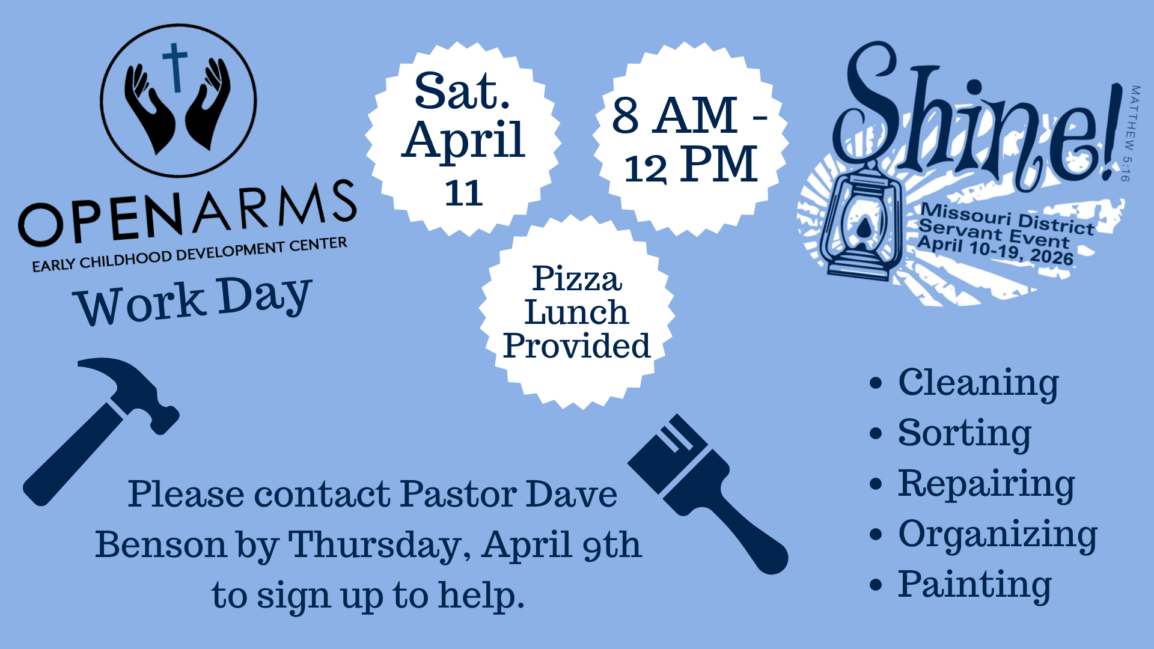 Open Arms Early Childhood Development Center will again be participating in the Missouri District-wide “SHINE” event by having a workday at the center, 1200 East McCracken Road, in Ozark on Saturday, April 11th from 8 AM to 12 PM. We will be cleaning, sorting, repairing, organizing, painting, and more inside and out (weather permitting). Please dress accordingly. A pizza lunch will be provided at noon. If you can participate, please RSVP with Pastor Dave Benson at [email protected] by Thursday, April 9th.